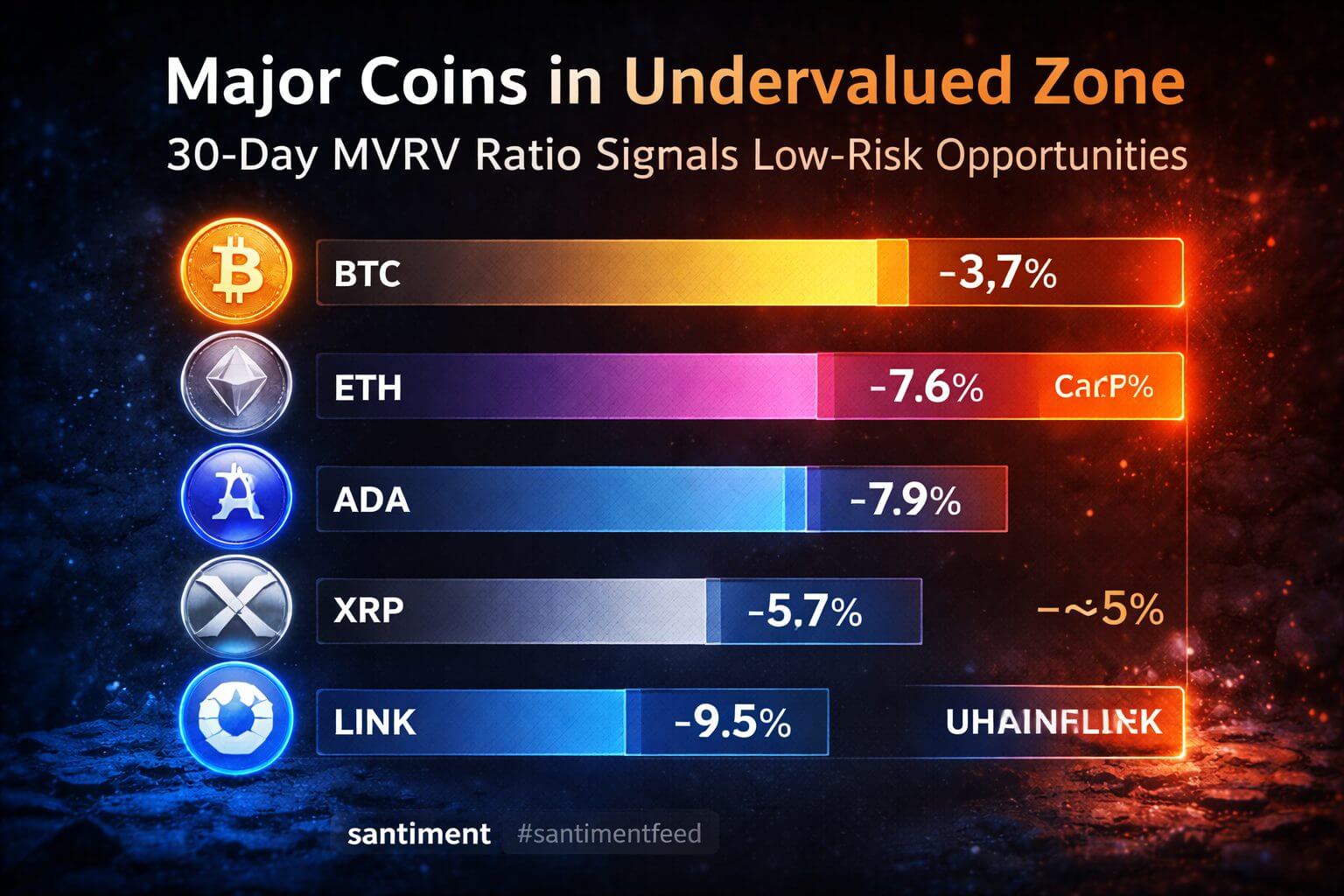 Laut Santiment befindet sich Chainlink mit einem MVRV von -9,5 % am tiefsten in der unterbewerteten Zone. Cardano folgt mit -7,9 %, Ethereum mit -7,6 % und XRP mit -5,7 %. Selbst Bitcoin, das in der Regel weniger volatil ist, weist ein MVRV von -3,7 % auf, was ebenfalls als leicht unterbewertet gilt.
